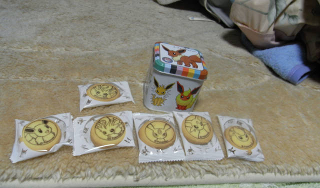 これ。主に缶が欲しかったので。480円と手ごろな値段も良し。中身のクッキーはもちろんイーブイ+7進化で8枚入り……じゃねえ!6枚しか入ってない上にリーフィア被ってるよ!ブラッキーもなんか身体が白くてびっくりだよ!