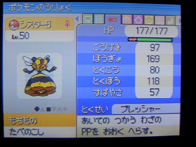 物理寄りの耐久特化で、攻撃手段がどくどくしかないので鋼とか来ると乙ります。後、ストーンエッジでも乙りますし、毒ポケモンに逆にどくどくされても乙ります。堅そうに見えてあんまり堅くありません!虫です!